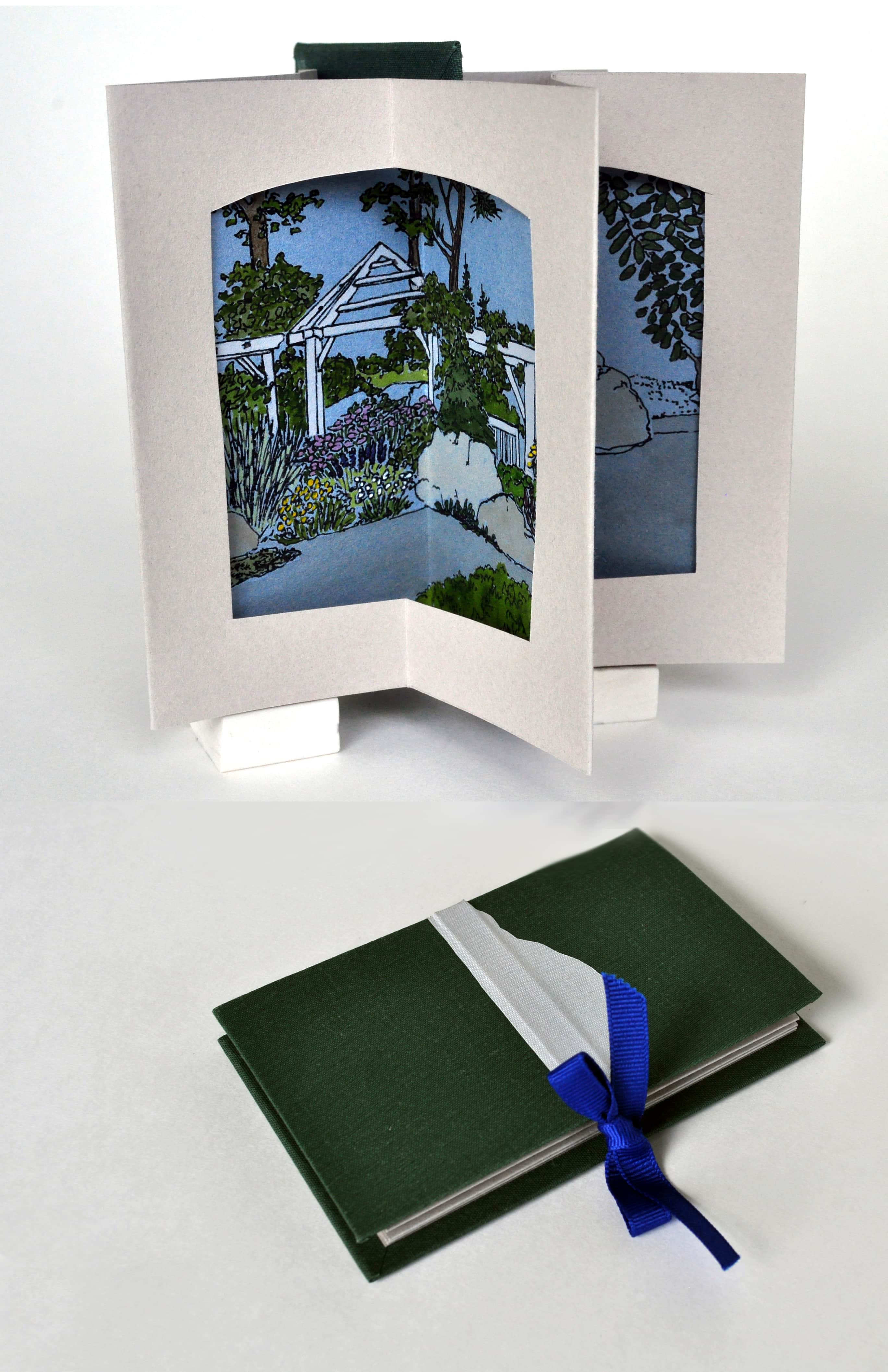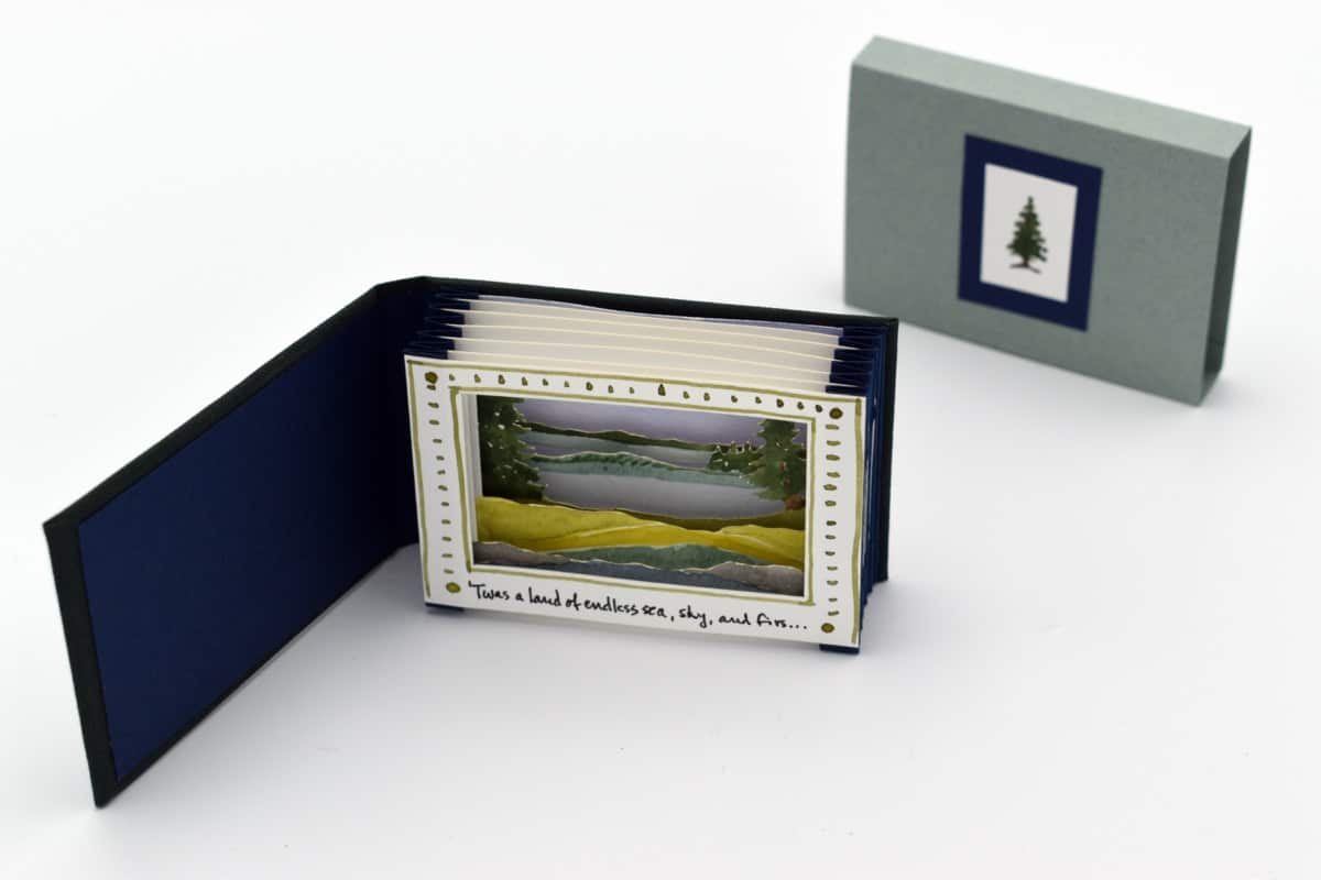 When fully opened, this “tunnel book” has five hand-painted frames that create a three-dimensional structure showing a scene of land and sea. The front frame bears the inscription ’Twas a land of endless sea, sky, and firs….. When closed, the structure fits into a green sleeve adorned with a pine tree. The completed book measures 2.25” h x 3.25” w x .50” d when enclosed in its sleeve. There are 50 books in the edition.