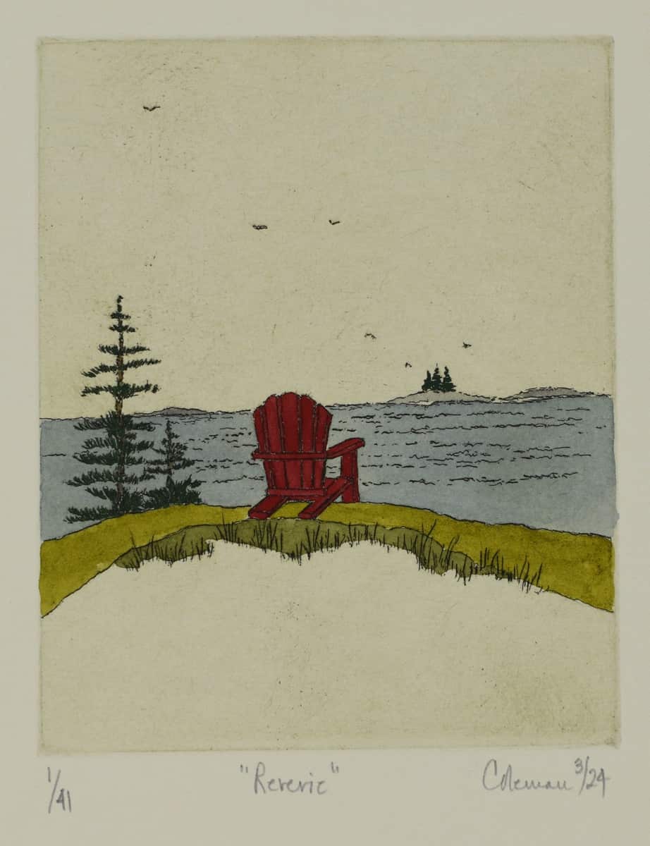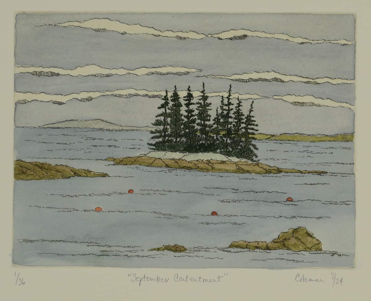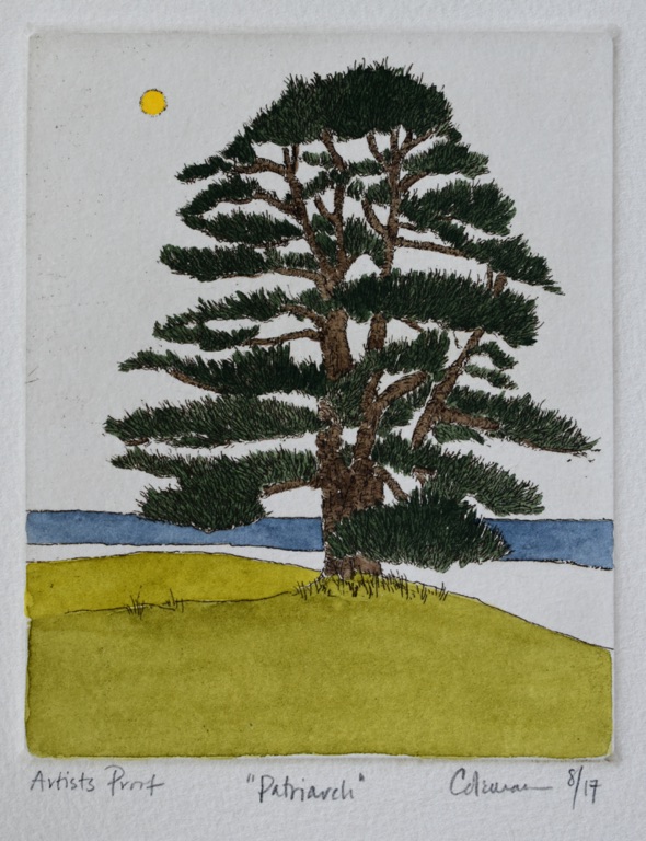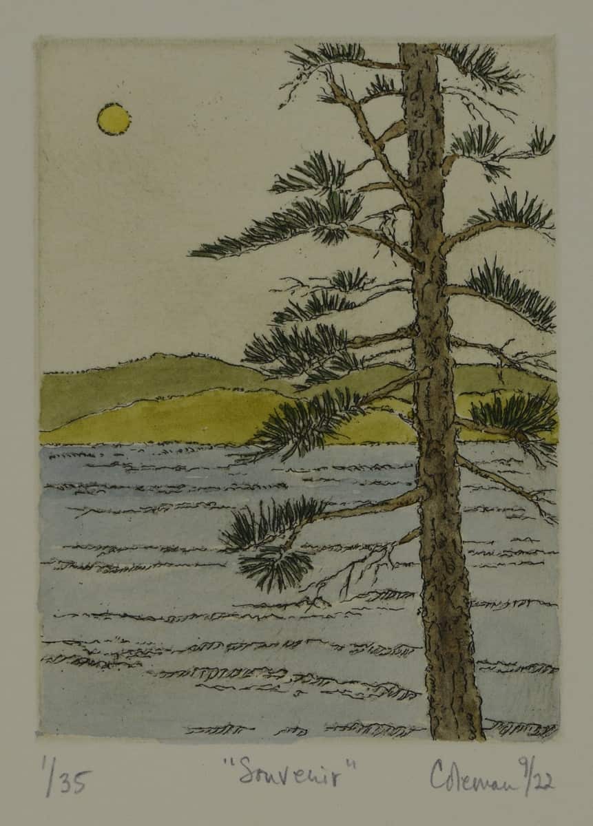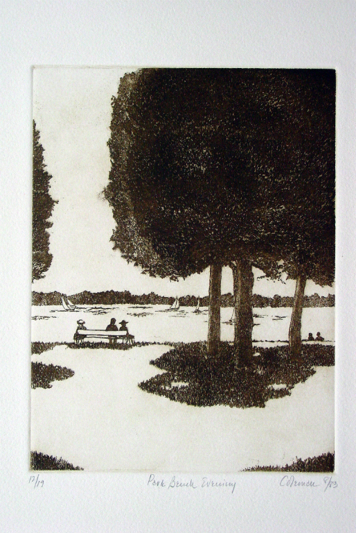 These prints are created using zinc plates on which the images are developed using a variety of drawing and soft ground processes. They are then printed in limited editions. In some instances the skies have been tinted by rolling a tone onto an inked, wiped plate. In other cases, color is added by hand after the prints have dried.